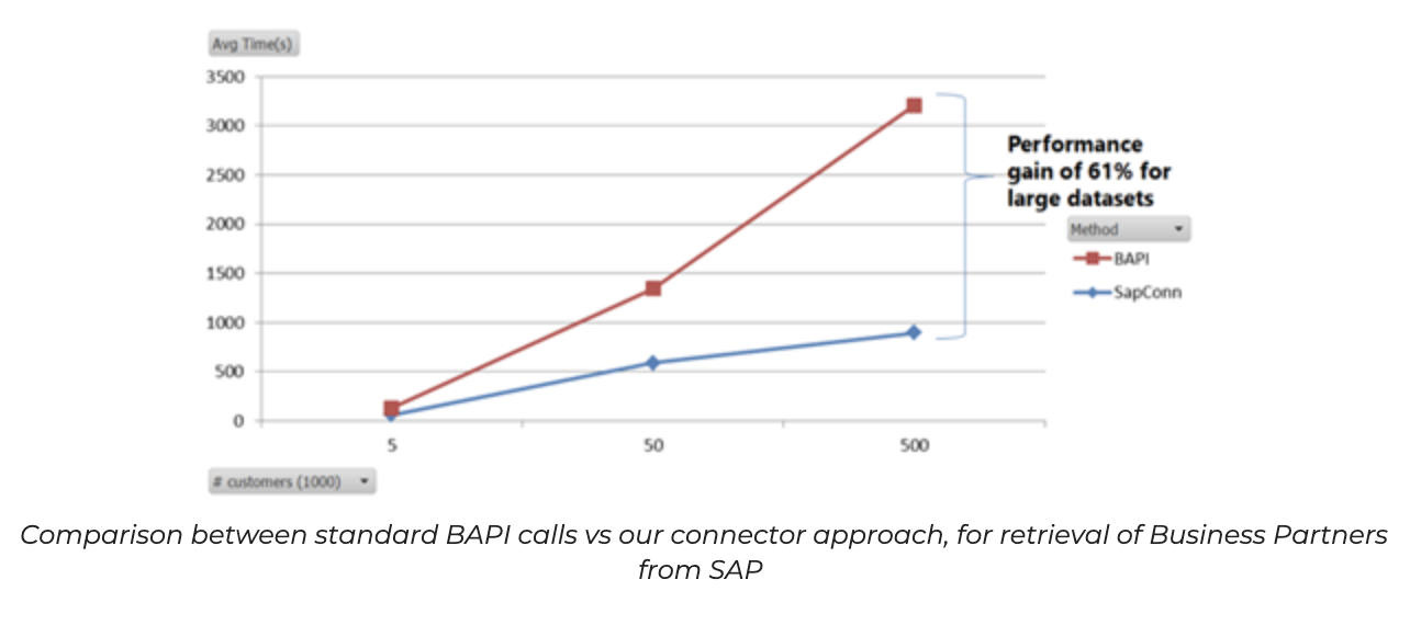 Sometimes using standard SAP interfaces (default BAPIs) is too much for the needs of a retail execution solution, both in terms of records (vertical) and of fields (horizontal). In our experience this leads to complex mapping and also performance issues, as sometimes just a few records are changed (e.g. for Business Partners) but the exposed interface hits a large number of records and fields, not only slowing the integration process but also using a lot of unnecessary server resources. Also, for the retail execution solution side, you can have the integration lasting hours, generating extra processing and possibly delaying the access to data of important field processes (e.g. an update in a service ticket of an in store deployed asset, like refrigerators, regulated by SLAs). We have tackled this problem by multiple forms, and one of them is using a reference architecture for an SAP connector, that can be installed as an RFC inside ECC, to extract only the specific fields needed for a typical retail execution solution (e.g. specific fields for Business Partners) and also only the changes since the last API access. We have experienced performance gains of up to ~60% for large amounts of records such as 500K business partners for example.