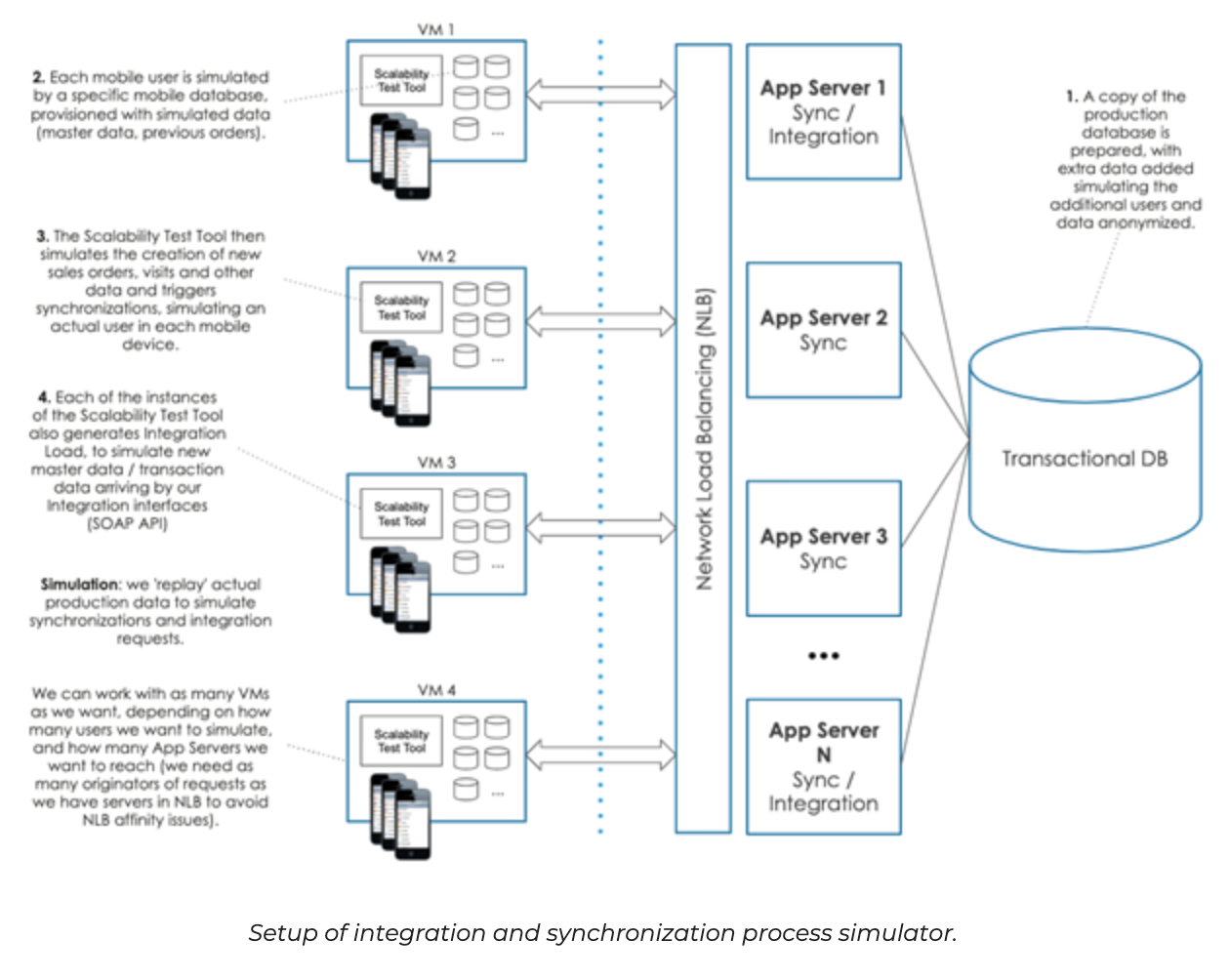 obviously scalability is key for any integration project, and it needs to be elastic and adaptable to your demands, otherwise you will either have a large invested capacity that is rarely used, or you’ll reach a bottleneck if you have an unplanned integration surge (e.g. critical short time campaign leads to millions of promotion related pricing condition records). Aside from the very important point that you should really plan ahead and consider your scalability and performance benchmarks within a safety margin, our experience has proven that simulating system behavior really can make a difference. Retail Execution solutions that rely on offline access from the mobile app typically work with a middleware architecture, which means that you can have conflicts between data synchronization from mobile devices and the transactional load from integration to and from SAP. Since it is very hard to anticipate all possible issues, having a simulation can really help you find critical issues in advance and fix them before it is too late. Spring has invested in a simulator tool that is capable of actually replaying actual production loads or simulated loads, executing processing logic that is driven by mobile device synchronization, web portal access, batch processes execution and of course the SAP integration load. For critical transactional systems like field sales, you should not risk going live without running a true simulation first. Below is a diagram with a simplified view of the simulation setup that we use: